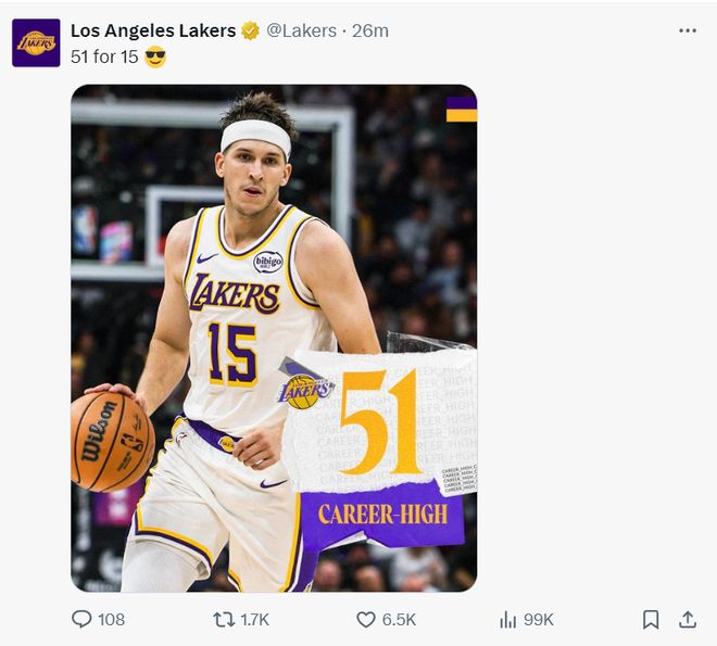 但赛后接受湖人媒体采访时里夫斯说道:嗯,这个夜晚的确非常精彩,但这跟我其他级别比赛创造的高分简直不值一提,我曾在高中的一场三加时的比赛中拿到过73分。(里夫斯这个回应时有些偷笑,有种笑侃不值一提的既视感)