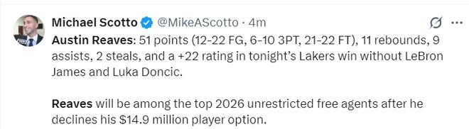 NBA记者迈克尔-斯科特写道:里夫斯在2026年夏将跻身不受限制自由球员的行列,因为他拒绝了自己价值1490万的球员选项。(也就是明夏里夫斯就是完全自由球员,他今夏拒绝了湖人四年8920万的提前续约邀请)