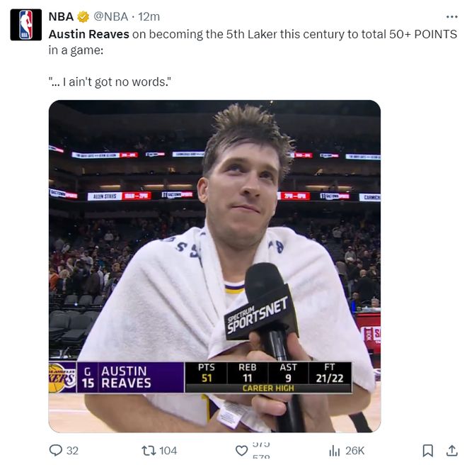 赛后奥斯汀-里夫斯拿到51+准三双直接登上了全美第二热搜,这场比赛湖人的赢球全靠他,除了詹姆斯、东契奇、海斯、克勒贝尔、蒂耶罗无法登场外,第三节文森特也崴脚,里皇真的独扛一队。