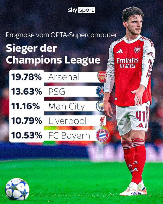 Opta预测欧冠夺冠概率前5:阿森纳第1,巴黎第2,曼城第3